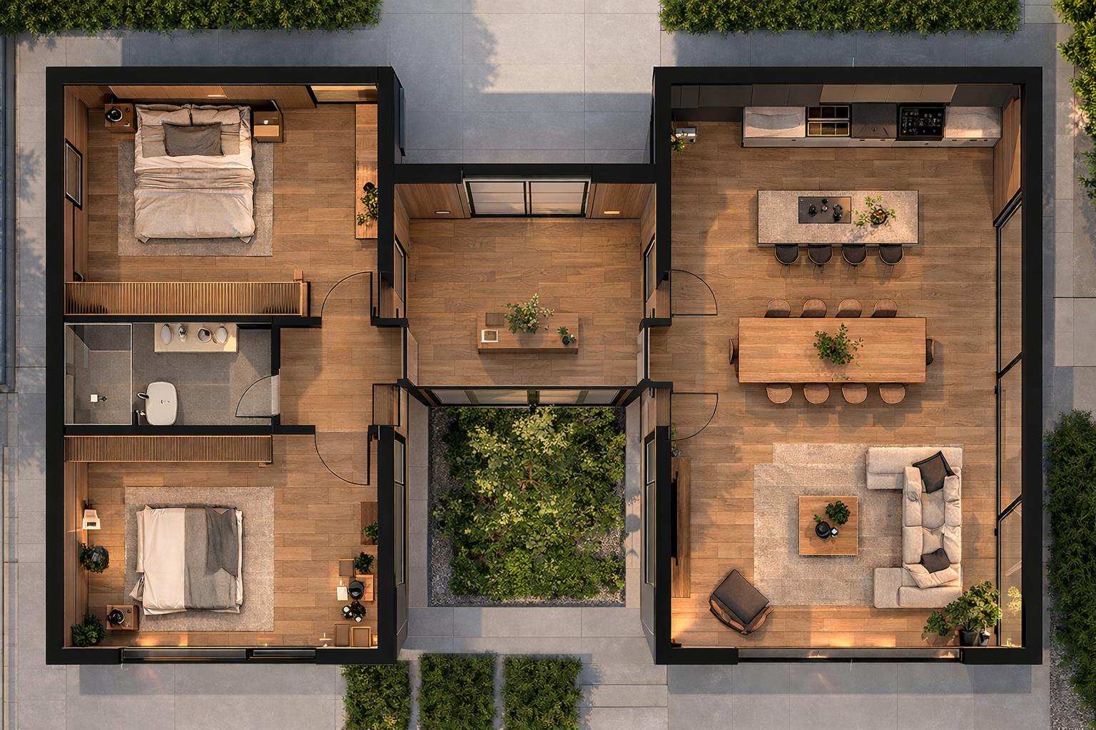 María is a modern modular home available in multiple finishes, including white façade, technical paneling or natural wood. With around 95 m², it includes 2 bedrooms, 1 bathroom and a bright open-plan kitchen-living area with large windows. All our models can be fully customized, adapting the square meters, layout, materials and finishes. Each home is designed to fit perfectly on your plot and tailored exactly to your needs.
