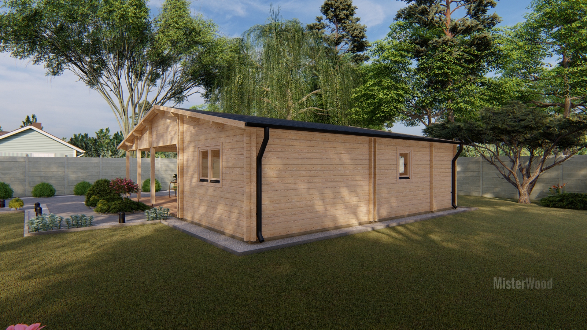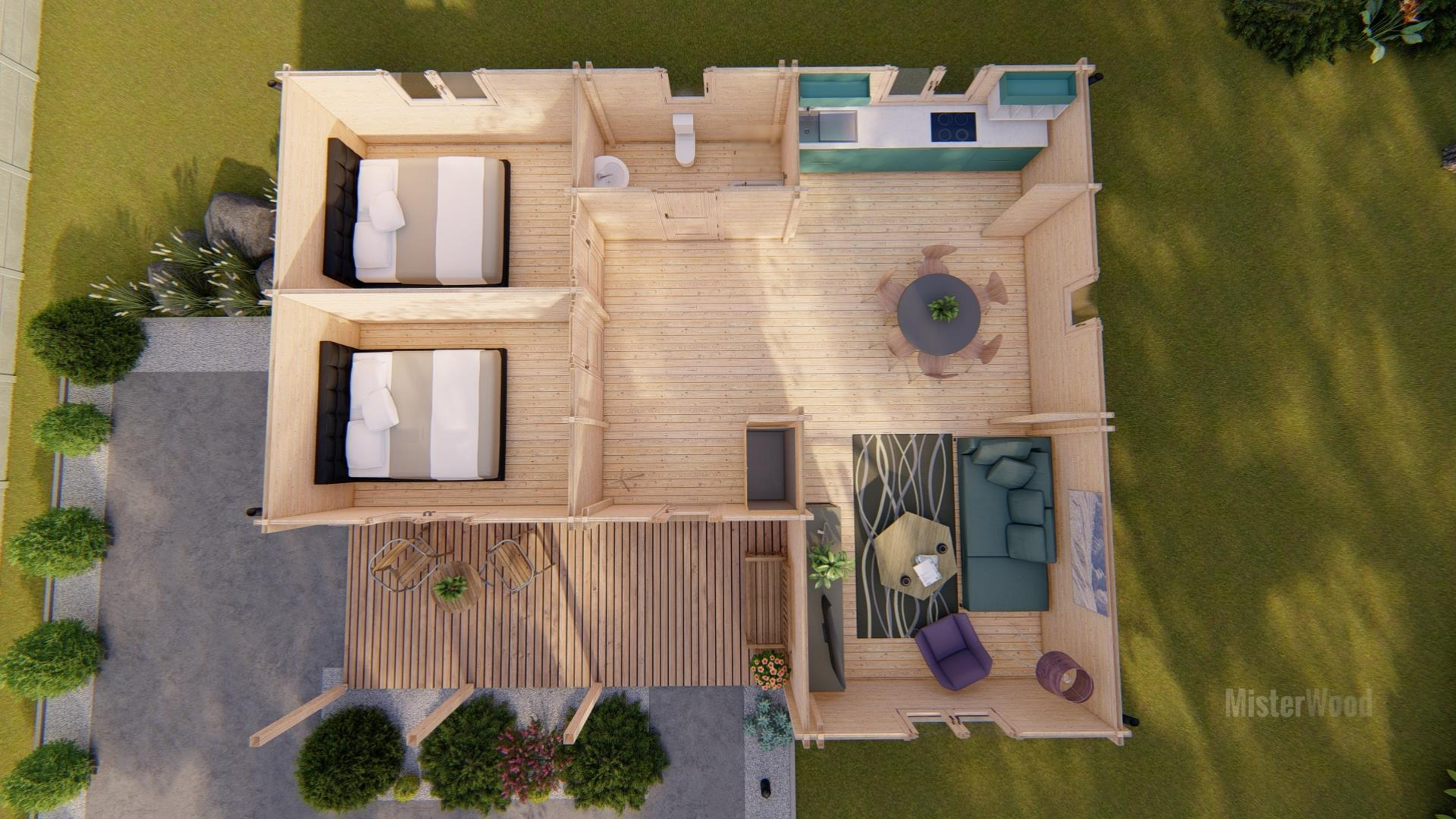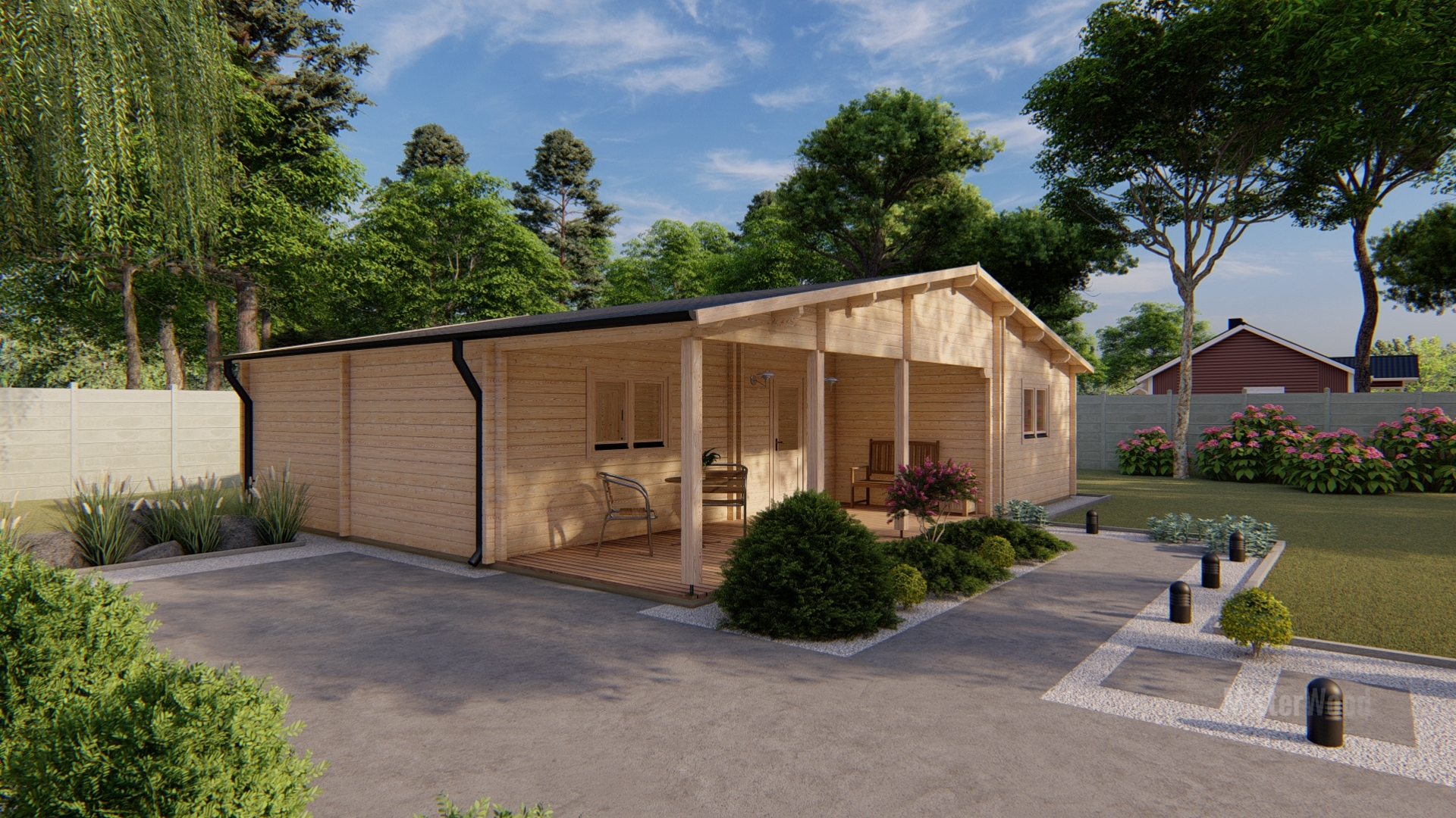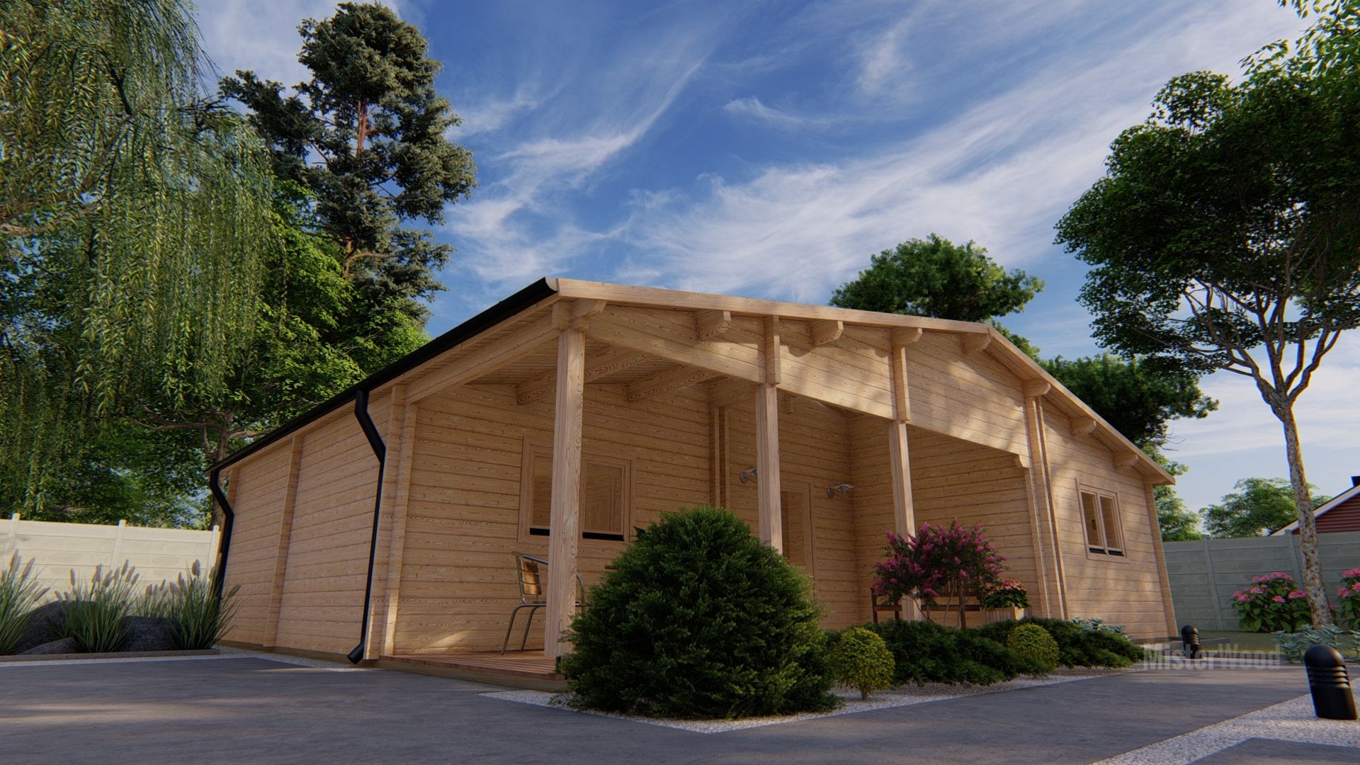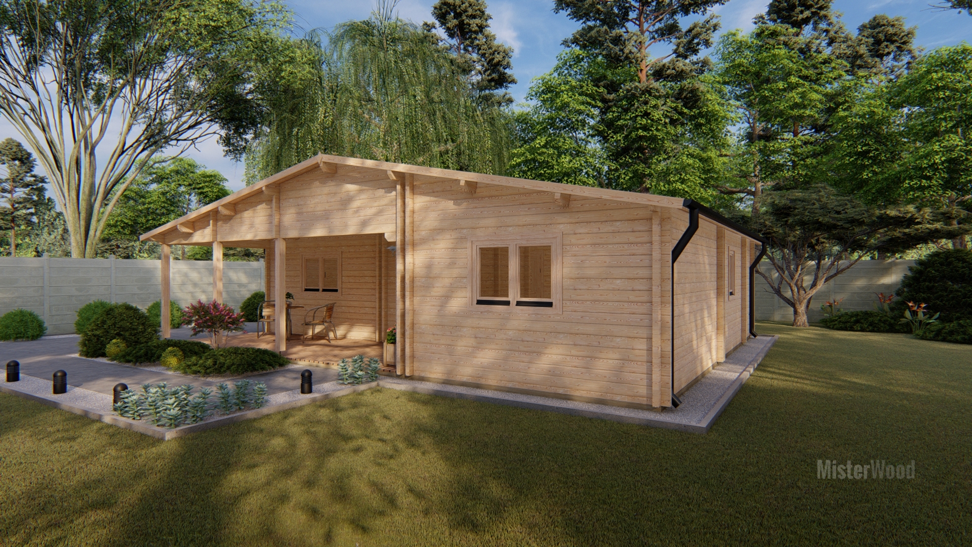 El modelo Miranda es una casa de madera con un diseño amplio y acogedor, con techo a dos aguas y un amplio porche frontal cubierto que crea un espacio ideal para disfrutar del exterior. Con una superficie de 87 m², su interior cuenta con una distribución de 2 habitaciones, 1 baño, cocina y un amplio salón comedor muy luminoso. Todos nuestros modelos pueden hacerse completamente a medida, adaptando los metros cuadrados, la distribución, los materiales y los acabados. Diseñamos cada vivienda para que se integre perfectamente en tu parcela y se ajuste exactamente a tus necesidades.