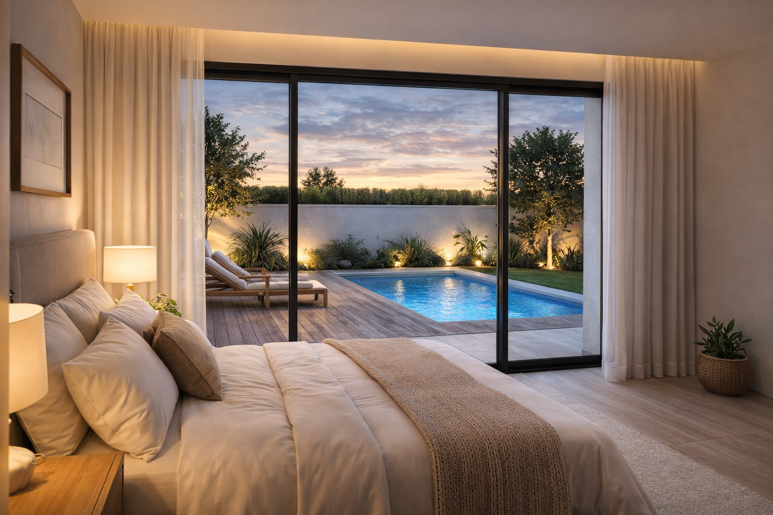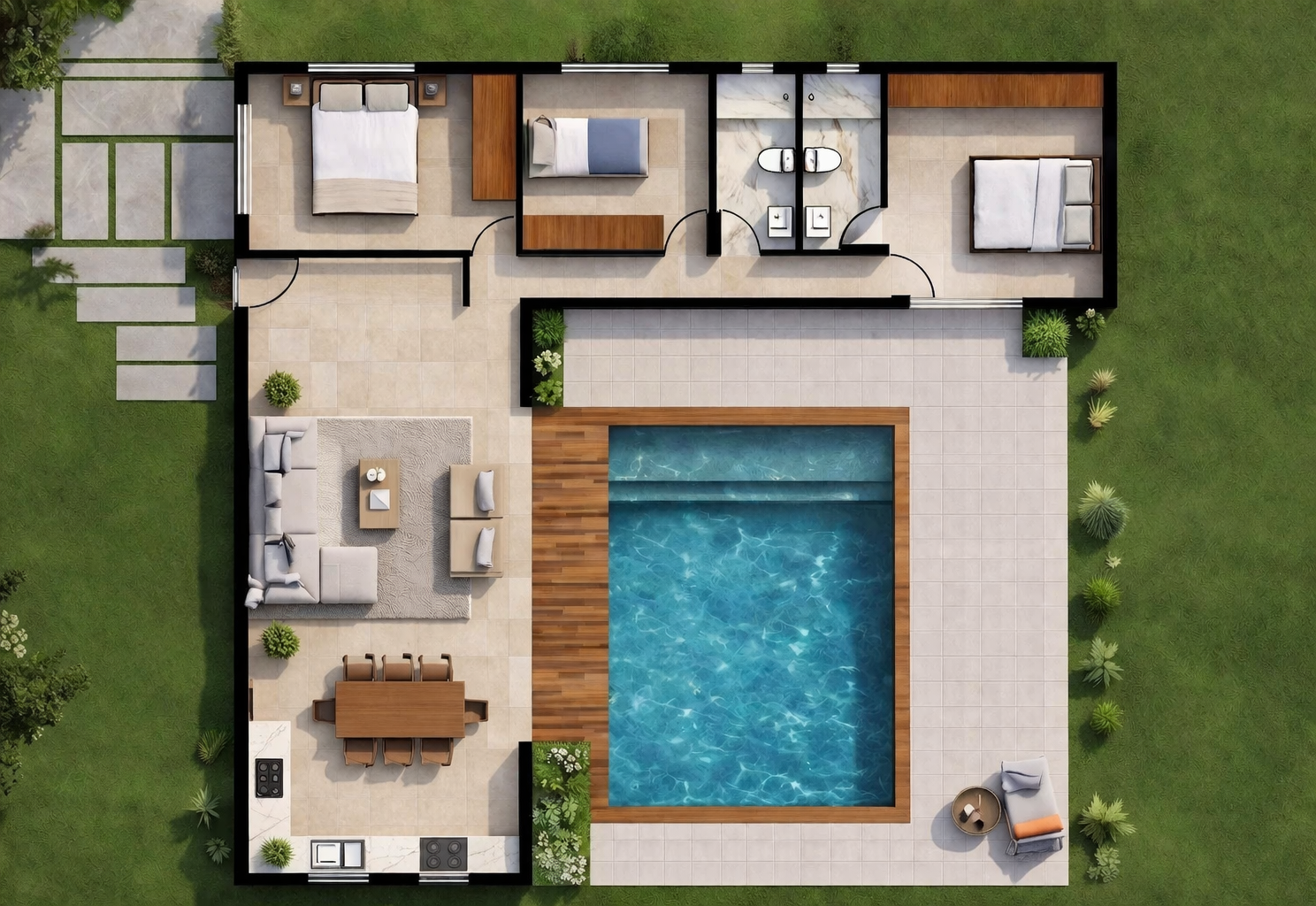 El modelo Iris es una casa moderna de 120 m² de una sola planta, diseñada para ofrecer funcionalidad, confort y una conexión total con el exterior. Cuenta con un amplio espacio abierto de salón, comedor y cocina, grandes ventanales que aportan luz natural y acceso directo a la zona exterior con piscina. Dispone de varias habitaciones y baños, con una distribución eficiente y práctica para el día a día. Todos nuestros modelos pueden hacerse completamente a medida, adaptando metros, distribución, materiales y acabados según tus necesidades. Creamos viviendas pensadas para integrarse perfectamente en tu parcela y estilo de vida.