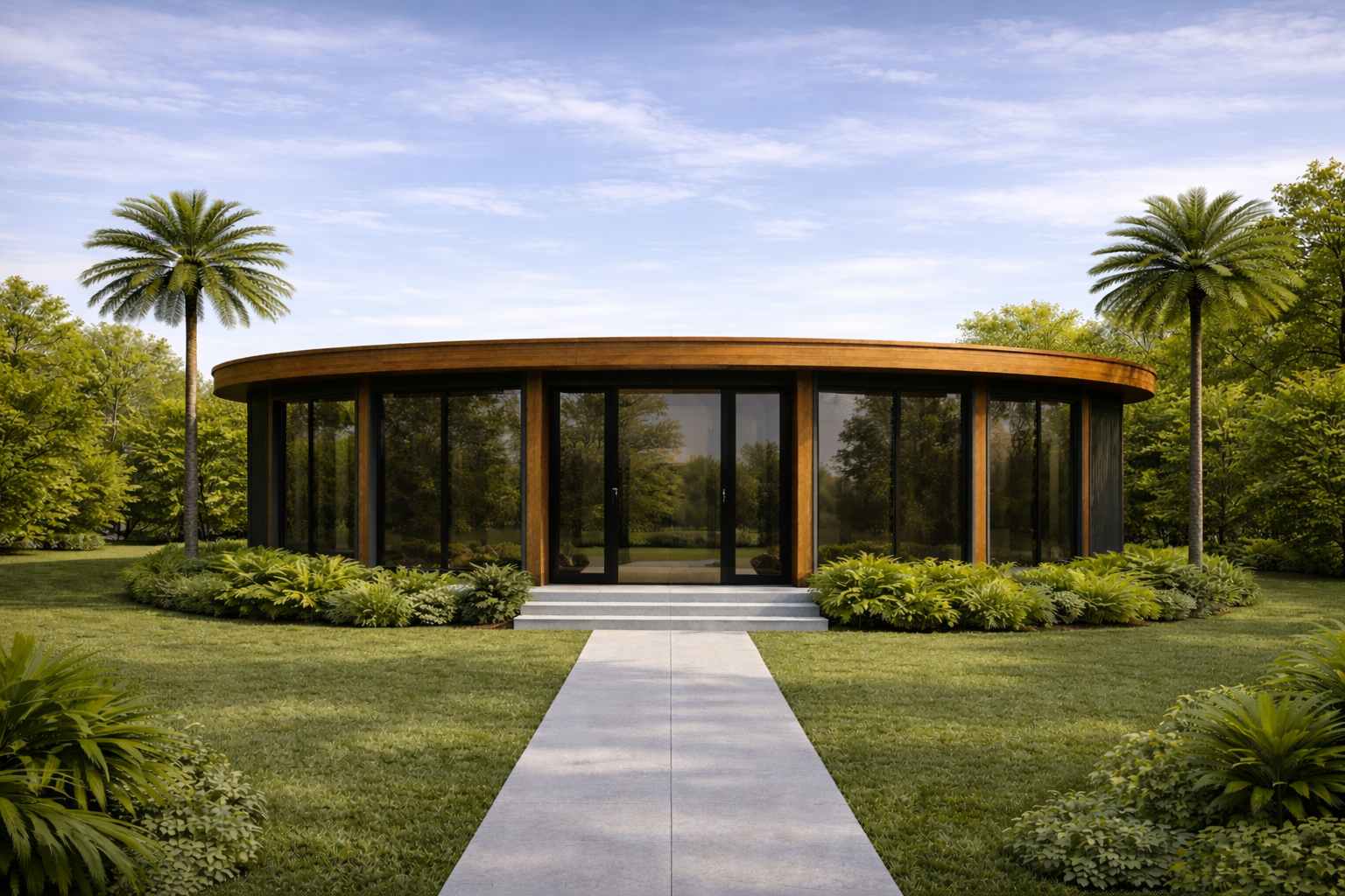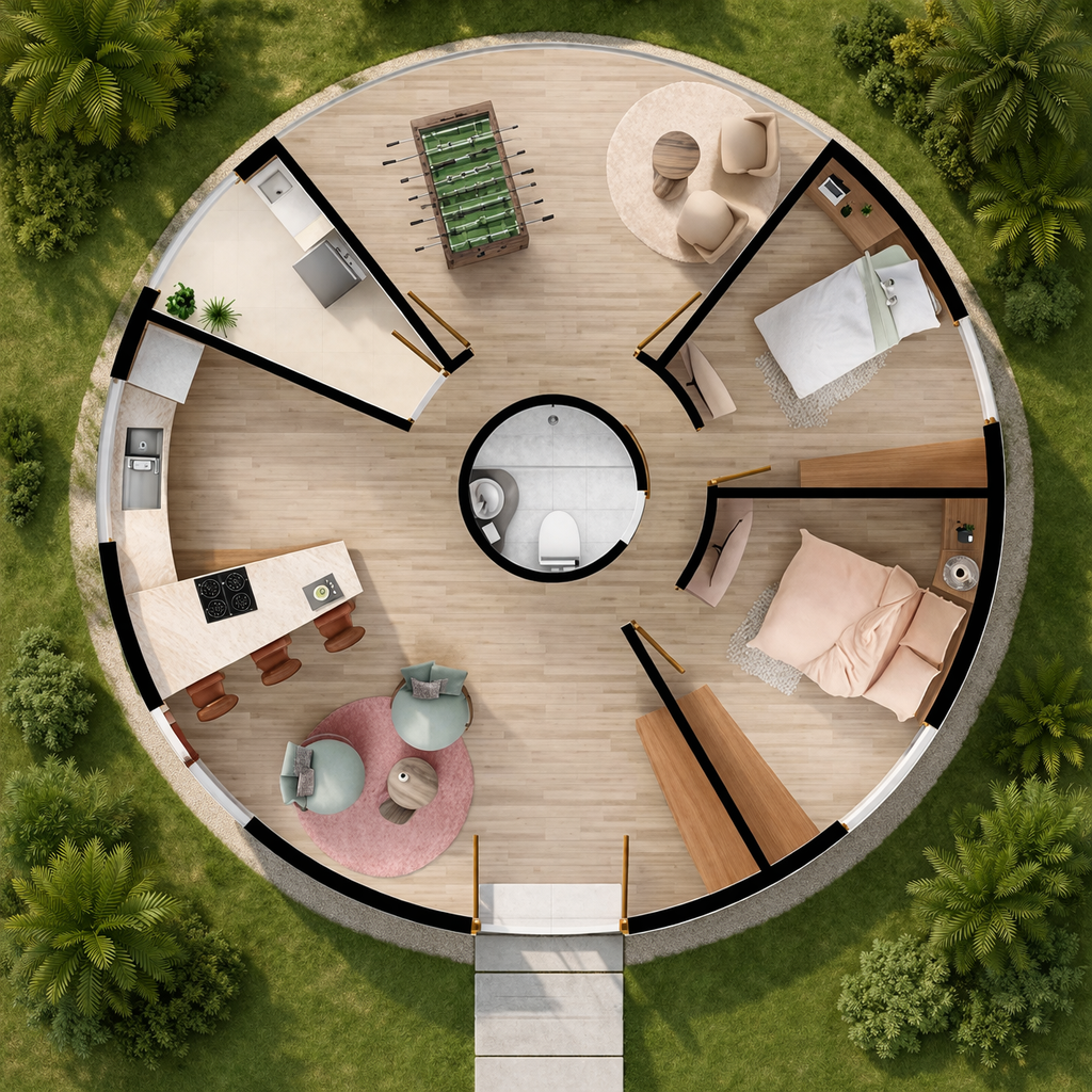 El modelo Susana es una vivienda de 120 m² con un diseño único y contemporáneo de forma circular, pensada para ofrecer funcionalidad, eficiencia y una conexión total con el entorno natural. Su distribución optimiza cada espacio, con una zona de día abierta que integra salón, comedor y cocina, amplios ventanales que aportan luz natural y varias estancias bien definidas, incluyendo dormitorios cómodos y un baño moderno. Su diseño envolvente crea una sensación de armonía, privacidad y confort en cada rincón. Todos nuestros modelos pueden hacerse completamente a medida, adaptándose a las necesidades de cada cliente.